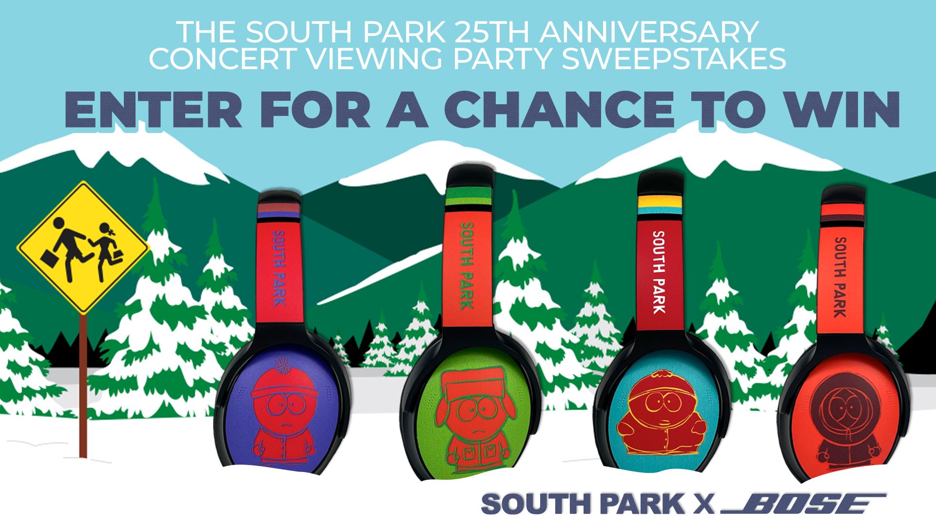 We’ve partnered with Bose to bring you the Concert Viewing Party Sweepstakes so a few lucky fans can enjoy the South Park 25th Anniversary Concert at home with Bose speakers or custom headphones! The concert features live performances from Trey Parker and Matt Stone, Primus, and Ween and it premieres August 13th on Comedy Central and streams the next day on Paramount+.