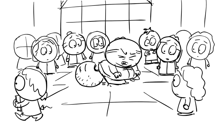 – This is art was used while creating the shot of Kyle sick in bed. You can see various stages of production here — from storyboard to character design to animation…