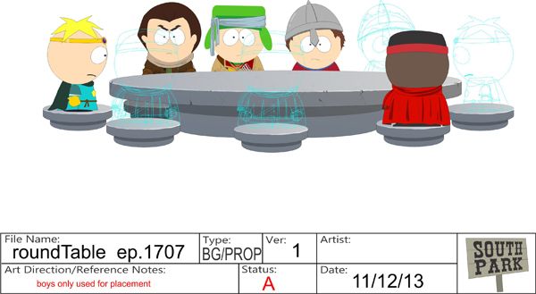 – The Round Table that Cartman, Butters and Xbox fighters sit at was a specialty prop. The boys “wireframes” were used for placement: